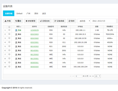设备基础信息查看,包括在线状态、信号强度、IP地址/端口、软件版本、网络模式、流量等。设备远程控制功能,包括设备重启、升级、查询参数、修改参数、抓包等。